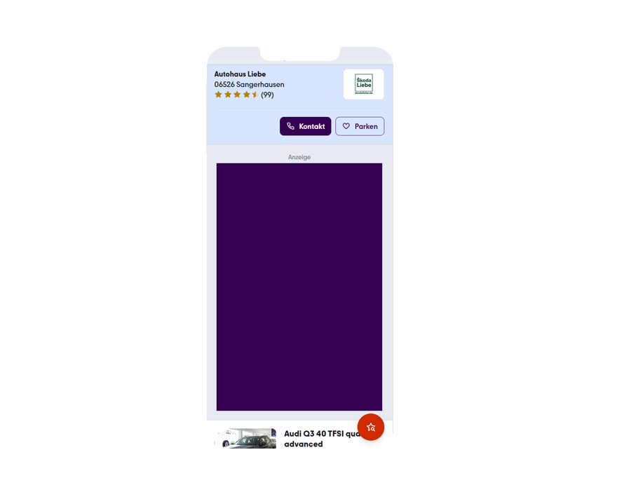 back All desktop mobile advertising sample Showcase Ad mobile.de Our Showcase Ad allows you to display 3-7 models at once. The native integration directly between our listings increases user acceptance and thus also campaign success. Specification (PDF, 322 KB)