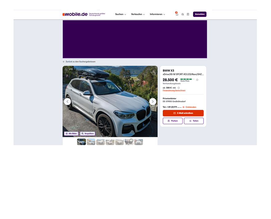 Das Billboard zählt zu unseren absoluten Premium Formaten. Es erscheint im oberen Bereich der Seite und ist sofort sichtbar, da es direkt unter der mobile.de Kopfzeile angezeigt wird.