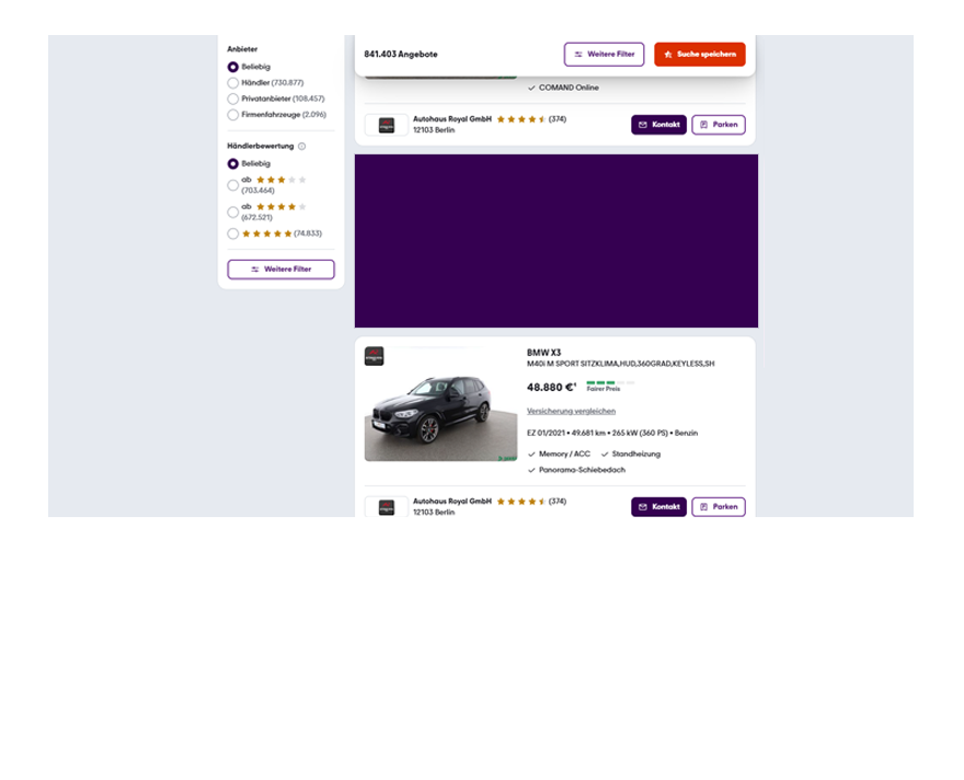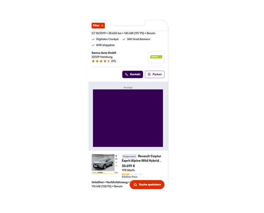All desktop mobile Werbebeispiel Premium Listing Ad mobile.de Die native Einbindung mit maximaler Sichtbarkeit auf der Fahrzeugsuchseite und hohem User-Engagement. Spezifikation (PDF, 324 KB)